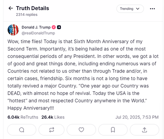 “哇,时间飞逝!今天是我第二个任期的半周年纪念日。”特朗普写道,“重要的是,这段时间被认为是历任总统任期内最具影响力的时期之一。换句话说,我们做了很多好事和大事,结束了多场与我们无关的国家的战争……”